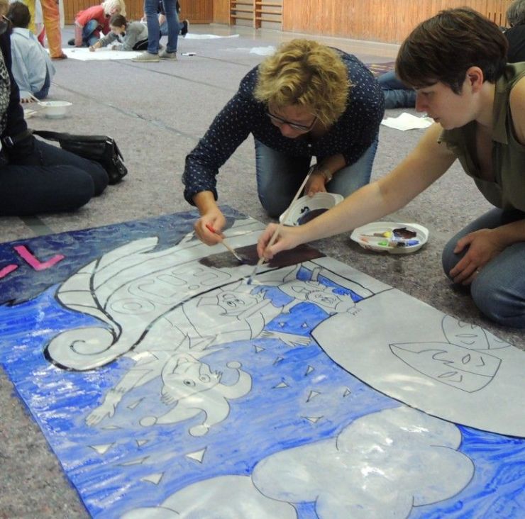 Neben Künstlerinnen und Künstler unterschiedlicher Initiativen waren auchdie Präsidentinnen der Frauenfastnacht Bensheim, Astrid Dochtermann und Angela Schmidt hier vertreten. Da ein Schiff auch Herberge bieten kann, lag es auf der Hand, dass ein „Narrenschiff“ das richtige Motiv für die Fastnachterinnen ist. Astrid malte bereits die Konturen des Narrenschiffs auf die vorgesehen Folie, sodass in der Kapuzinerhalle nur noch die farbliche Gestaltung erfolgen musste.